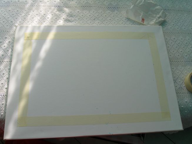 Στον παρακάτω πίνακα έχω κάνει την κορνίζα με στόκο: σχημάτισα με χαρτοταινία ένα πλαίσιο πάνω στον καμβά και άπλωσα στόκο με μια σπατουλίτσα γύρω γύρω.....όταν ξεράθηκε σχεδόν έβγαλα την ταινία και δημιουργήθηκε ένα πλαίσιο. Στη συνέχεια το έβαψα χρυσό.