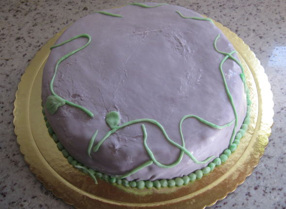 Η τούρτα για να φτιαχτεί μου πήρε δύο ολόκληρες ημέρες.....δεν ήταν τόσο η δουλειά που έπρεπε να γίνει, όσο ο χρόνος που χρειαζόταν για να παγώσουν οι στρώσεις, ειδικά με τόση ζέστη που έκανε αυτές τις μέρες! Αρχικά έφτιαξα τρία παντεσπάνια με διάμετρο 30 εκατοστά, τα έβρεξα λίγο με σιρόπι και έβαλα ενδιάμεσα κρέμα ζαχαροπλαστικής. Χρωμάτισα λιλά τη ζαχαρόπαστα και την άνοιξα σε φύλλο,(απίστευτη ταλαιπωρία, καθώς έκανε τόση ζέστη που το φύλλο κολλούσε παντού, δεν ΄πα να έβαζα από κάτω στρώμα την άχνη, δεν 'πα να τό 'βαζα πάνω σε λαδόκολλα, το ίδιο του έκανε....τελικά προσπάθησα και το ξεκόλλησα από τη λαδόκολλα, αλλά με συνέπεια να μη γίνει λείο και να σπάσει σε κάποια σημεία....τέλος πάντων, προσπάθησα να το καλύψω). Καλά κακά την κόλλησα με βουτυρόκρεμα στην τούρτα. Αυτό μου πήρε ολόκληρη την πρώτη ημέρα, γιατί η κάθε στρώση που έμπαινε έπρεπε να παγώσει στο ψυγείο καλά για να μπει η επόμενη....Το βράδυ της πρώτης ημέρας έφτιαξα τα παντεσπάνια για το δεύτερο ΄'όροφο" και τα είχα έτοιμα για την επομένη.